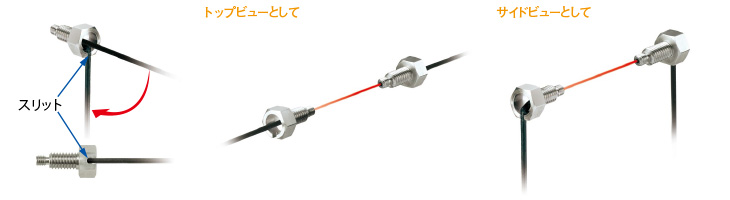 ナット部側面のスリットに合わせてファイバケーブルを曲げると、サイドビュータイプとして使用可能なNF-TR14。取付状況に 応じてサイドビューとトップビューを切り換えてご使用いただける、今までにない新発想のファイバユニットです。
