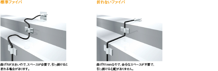 折れない(R1mm)タイプのファイバユニットは、許容曲げ半径1mm! ファイバの取り回しを気にせずに設置できます。