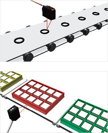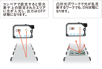 拡散反射型のセンサが受光量の増減で動作するのに対し、BGSセンサは距離を判別して動作するので、ワークの色や光沢・傾きの影響に強く、安定した検出ができるのが特長です。