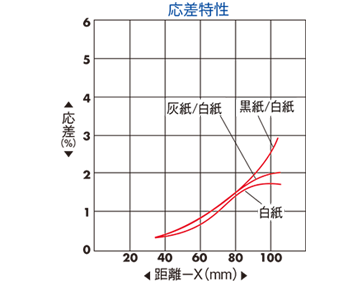 ワークの色、距離(横軸)を確認した上で、距離×縦軸の応差を算出すると、そのセンサがどれだけの段差判別ができるかがわかります。