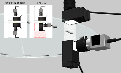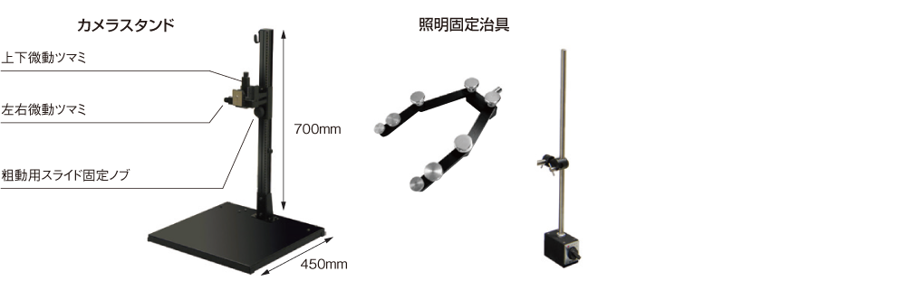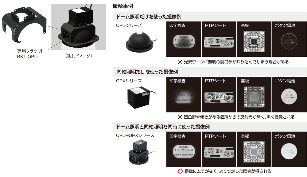 基本セットに含まれる専用金具を用いて、②ドーム照明OPDと③同軸照明OPXを組み合わせてご利用いただけます。