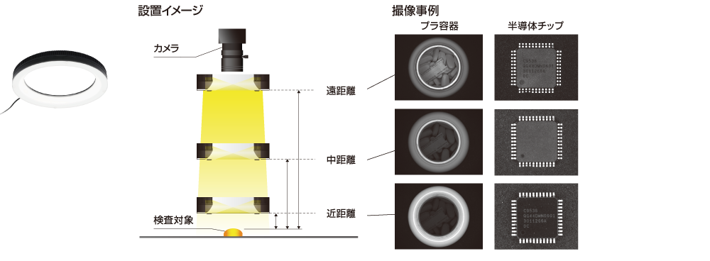 ワークのエッジを強調させるローアングル照射から、ワーク全体を均一に照射できるハイアングル照射まで1台の照明で様々な用途にお使いいただけるリング照明です。