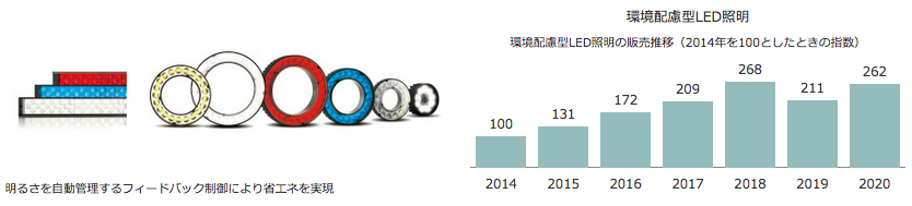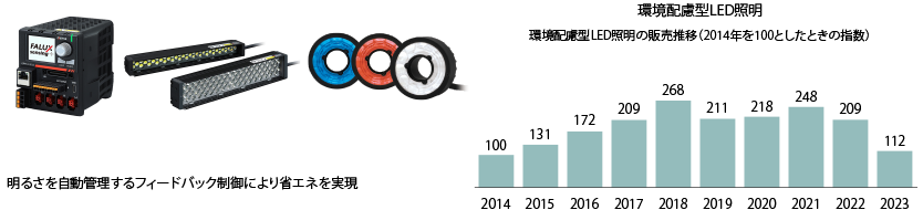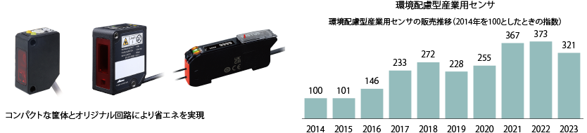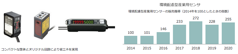 当社では自社製品の産業用センサや画像検査用LED照明のうち、特に環境負荷の低減につながる製品を「環境配慮製品」と定め、その販売個数に目標を定めております。