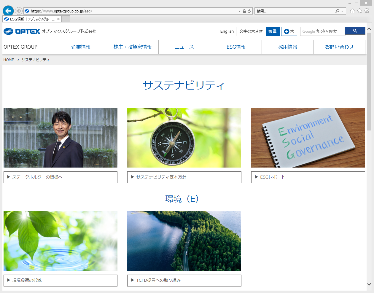 オプテックスグループでは、環境(Environment)、社会(Social)、ガバナンス(Governance)という 3つの視点から中長期的な成長を目指すESG経営を推進しています。- サステナビリティ(オプテックスグループサイト)