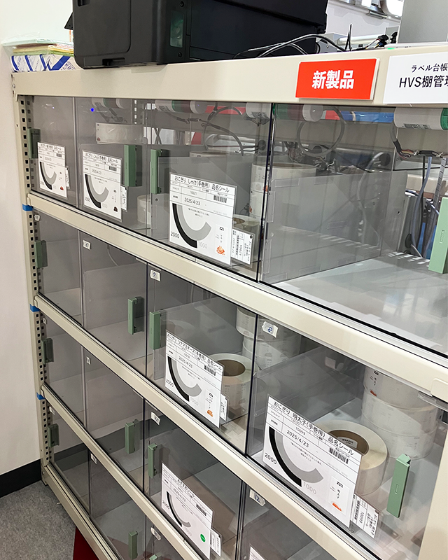 食品ラベルの検査に使用するラベル台帳やラベルのロールなどの資材を管理する棚システムをご紹介しました。誤った棚の扉を開くと赤色ランプが点灯する様子もご覧いただきました。