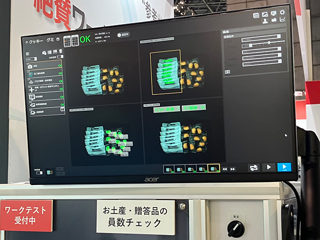 箱に入った個装袋の個数カウントを行うAI画像検査装置を参考出品しました。個数カウント以外にもルールベースでは難しい検査課題をたくさんヒアリングさせていただきました。