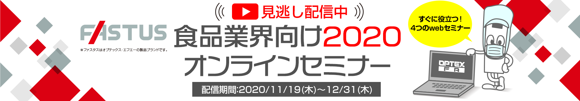 オプテックス・エフエーでは、11月に開催しましたオンラインセミナーイベント「食品業界向けオンラインセミナー2020」の 見逃し配信を行います。FA会員にログインすれば、期間中いつでも当日のセミナームービーをご覧いただけます。