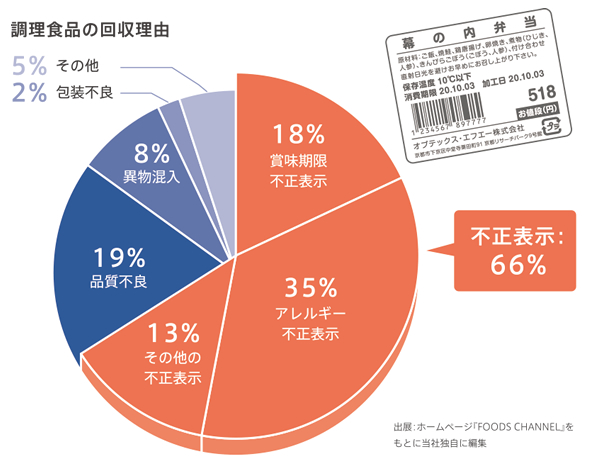 • 原因のーつとして、弁当や惣菜といった「中食業界」でのラベル誤貼付や表示の欠落による回収が挙げられます。多くの原材料から構成される調理食品はそれだけ不正表示のリスクが高くなります。