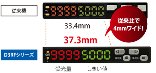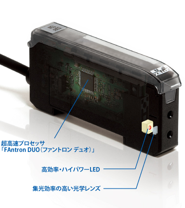 新プロセッサ「FAntron DUO」の搭載により、従来の単一パルス幅投光ではなく、長短2種類のデュアル・パルス幅投光を実現。加えて、ハイパワーLEDや高効率集光レンズとの相乗効果で、反射型で従来比最大3倍、透過型で従来比最大5倍に検出距離がアップ。