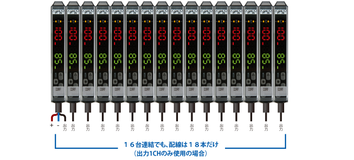 最大16台まで連結可能。その際、子機の配線が出力線のみになるため、配線工数が1/2以下に削減できます。
