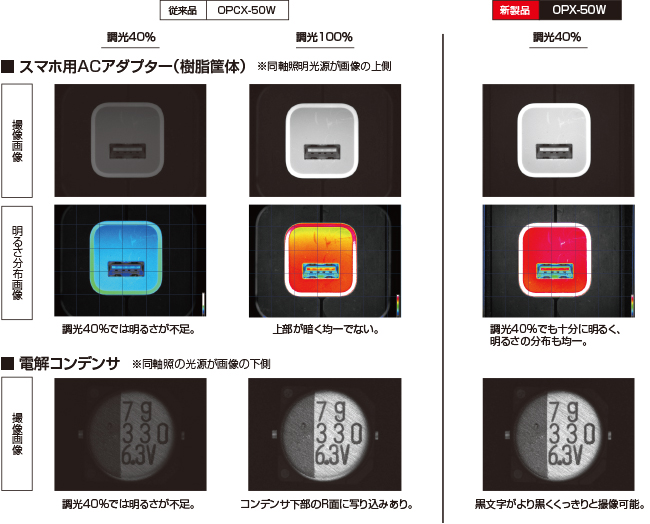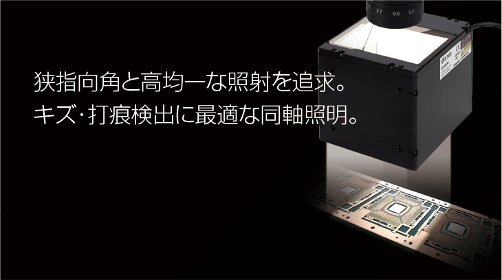 従来、指向性を高めて均一に照射するために同軸照明をワークから離して使用していました。このため照射エリアが狭くなり、照明サイズを大きくする必要がありました。OPXシリーズなら、近距離からの均一照射が可能で、かつ周辺部の輝度低下を抑えているため、より広い照射エリアを確保できます。