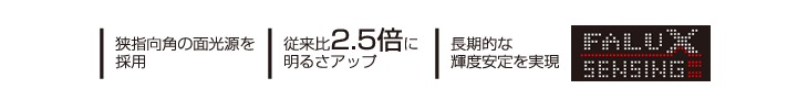 OPXシリーズは、独自技術の「FALUX sensing」を搭載。内蔵したフォトダイオードが輝度をモニタリングし、輝度劣化をフィードバックすることで、5万時間でも最大輝度を一定に保てます。