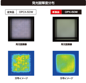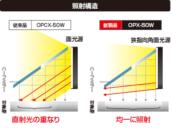 OPXシリーズは、狭指向角光源の採用により光の広がりを抑え、指向性の高い照射を実現。近距離照射の場合でも高均一な照射が可能となります。