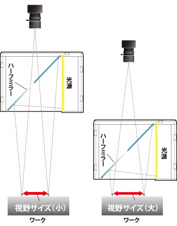 また近距離照射の場合、光源からの直射光とハーフミラーからの落射光が重なり、検査面を均一に照射できません。
