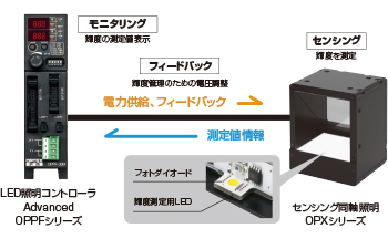 また、OPXシリーズは、面光源の筐体フレームに輝度測定用LEDとフォトダイオードを内蔵し、外乱光ノイズの影響を受けずに正確な輝度測定が可能です。