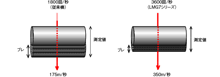 従来機と比較して2倍の測定回数(3600回/秒)を高速安定制御回路で実現。 従来の1/2の測定時間で高精度が出来ます。繰り返し精度も大幅に向上しました。