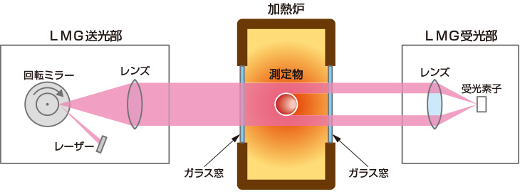 加熱炉の中にセットされた測定物を炉壁に設けられた窓ガラスを通して測定。