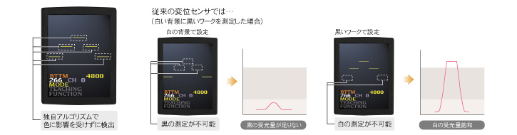 従来の変位センサでは、受光量が最適レベルになるように光量制御を行っていました。これをライン状の幅広計測に応用した場合、ワークや背景の色ムラに対応するためには1回のサンプリングでは限界があり、複数回のサンプリングが必要でその分、処理時間が必要でした。そこで当社独自の光学系と独自アルゴリズム(特許出願中)によりワークや背景の色ムラに影響されることなく1回のサンプリングで測定を実現しました。