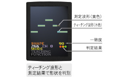 ライン状の投光ビームと三角測量の原理を用いて物体の高さ形状を1回のサンプリングで測定し、あらかじめ登録しておいたティーチング波形と測定結果を比較して物体の高さ形状の一致度を算出し、しきい値と比較することで良否を判定します。また、ズレ許容度を設定することで形状余裕度を変更でき、ばたつきにも対応できます。