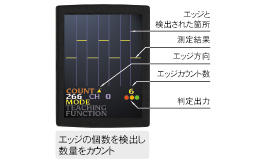 ライン状の投光ビームと三角測量の原理を用いて物体の高さ形状を測定し、その高さ形状からエッジ情報を抽出して、エッジの個数をカウントすることで幅広測定エリア内の物体の数量をカウントし、予め登録しておいたしきい値との比較で、一致度判定が可能です。測定に高さ情報を用いることで物体の色の影響を受けずに複数個の同時カウントを実現しました。