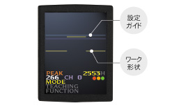 本体には、暗い場所でもはっきり見えるLCDディスプレイを搭載。ワークの形状と設定ガイドの表示色の区別がはっきりわかり、小さなワークのシビアな設定でも画面を見ながら容易に作業が行えます。