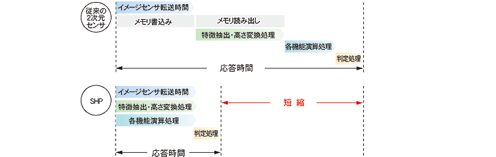 従来のセンサはイメージセンサからのデータを一旦メモリに書き込み、そのデータを再度読み出して処理しています。SHPは、イメージセンサからのデータ転送と並列に特徴抽出・高さ・変換処理、各機能ごとの演算処理を平行して行うことで高速処理を実現しています。