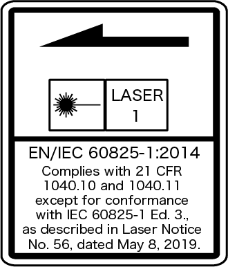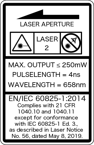 この製品は可視光レーザビームを放射しており、EN/IEC 60825-1のレーザ安全規格のCLASS 1またはCLASS 2に相当します。センサ側面には規格に沿った警告・説明ラベルが貼付されています。