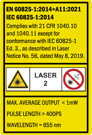 この製品は可視光レーザビームを放射しており、IECレーザ安全規格のCLASS 2に相当します。センサ側面には規格に沿った警告・説明ラベルが貼付されています。