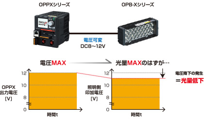 DC12V 出力仕様のOPPX の場合、出力電圧をDC8~12V、1000階調で出力調整します。延長ケーブルを使用すると、OPPXの出力電圧に比べて、実際に照明に印加される電圧が下がるため、光量が低下します。