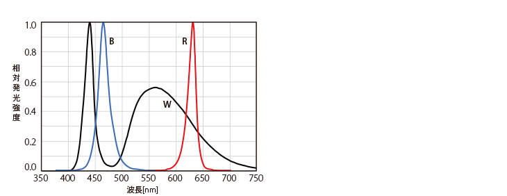 ●□=R:赤(635nm)、W:白(4,900K)、B:青(465nm)●スペクトル分布図は下記をご参照ください