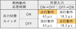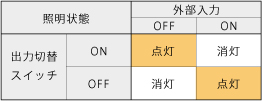 外部点灯制御を【入力時照明ON】と【入力時照明OFF】に極性を切り替え可能です。外部入力ON時でも、出力スイッチで照明のON/OFF切替ができます。