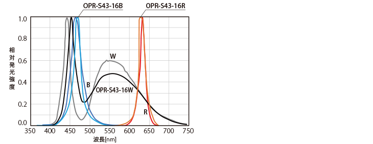 | 色温度 / ピーク波長 | Φ43 | 6,200K | 620nm | 470nm |