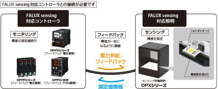 独自技術の「FALUX」を搭載。照明内部温度を測定することで温度上昇による輝度変化を、照明単体で補正します。