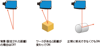 背景からの反射光で距離を測定し、距離が変化したり受光できなくなると検出するのがObSBモードです。
