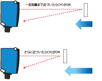 制御出力を2CH装備。検出距離を個別に設定できるので、 一定距離まで近づいたらON、さらに近づいたらONと いった2段階出力が可能です。