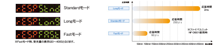 標準のStandardモード以外に、応答時間を短くし近距離で高速ワークを検出するFastモード、検出パワーを上げ光量不足を補い安定検出するLongモードを選べます。