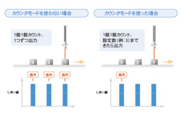 ワークを3個カウントしてから袋詰という動作に入る場合、センサがワークを検出するたびに出力するのではなく、あらかじめ設定しておいた数字(個数:0~9999999まで)になってはじめて出力します。また、カウンタモード時、デジタルモニタはカウントした回数を表示します。さらに、制御出力CH2をカウンタリセット入力として設定すれば、外部入力によりカウンタのリセットが可能です。。