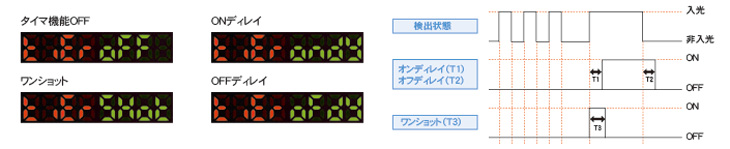 タイマ時間を設定可能。オフディレイ、オンディレイ、ワンショットの3種類から選べます。ワンショットタイマを使えば、大きさの違うワークが流れてきても出力時間を同じにできます。