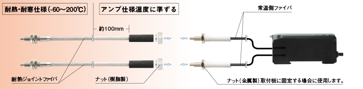 フリーカットの常温側ファイバと耐熱ジョイントファイバを接続することにより、ファイバどうしの脱着を容易にし、またファイバ長の調整を可能にしました。
