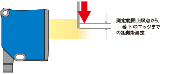 エッジ測定タイプは、センサの上面側の測定範囲の上限点から、一番下のエッジ位置を認識し、その2点間の距離に比例したアナログ値を出力するタイプです。