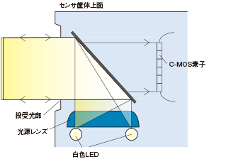 2つの白色LEDとレンズ、ハーフミラーにより長方形のスポットで投光し、C-MOS素子で受光されます。