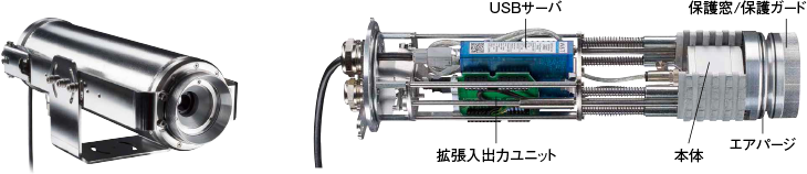 水冷による315℃までの高温環境にて使用可能なハウジングケースとなります。前方吹出しのエアパージは標準で搭載しています。