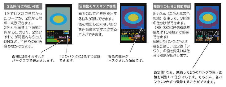 色面積センサCVS1の色面積判別機能をさらに進化させることにより、2色同時の色面積判別が可能になりました。