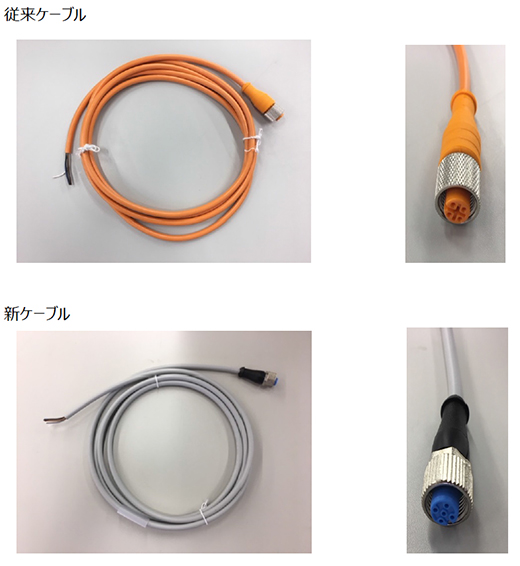 標記の件、下記のセンサ⽤オプションケーブルにつきまして、型式が変更となります。また、原材質・製品仕様等の変更はございませんが、被覆⾊につきましては、従来品の橙⾊から灰⾊に変更となります。