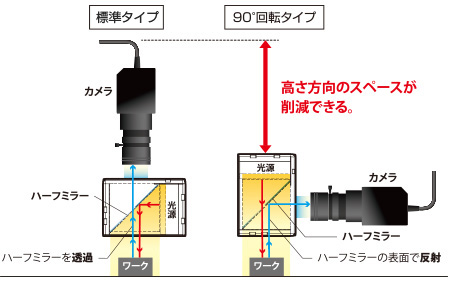 ※の低下を解消します。標準タイプの構造では、ハーフミラーを透過した後にカメラに入光しますが、90°回転タイプはハーフミラー表面で反射した光がカメラに入光する構造のため、高精細な撮像が可能です。