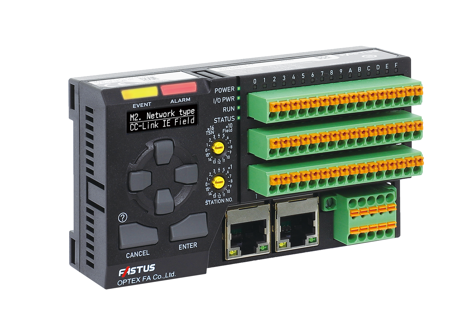 操作面には10言語表示に対応する有機ELディスプレイ、操作ボタン、イベント/アラーム表示灯を搭載。PCやHMIを使用せずに当機上でデバイス機器のパラメータ、メンテナンス、エラー情報などの設定確認・変更が可能です。しかもW110×D31.4×H63mmとコンパクトな機体を実現しました。