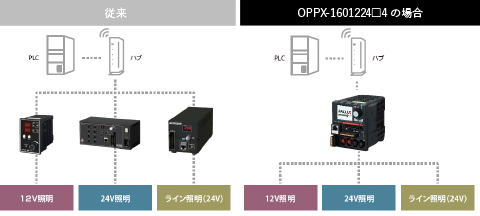 従来は入力電圧の異なる照明を使う場合、それぞれにサイズや仕様が異なる専用電源が必要でしたが、OPPX-1601224□4は出力電圧12Vを2ch、24Vを2chずつ用意しているため1台で対応が可能となります。調光方式についても、汎用照明で利用される「PWM調光」、ライン照明に最適な「定電圧調光」、高輝度発光が可能な「ストロボオーバードライブ」の3つに対応しているため、多様な照明を混在して接続でき、1台で様々な検査用途に柔軟に対応します。また上位PLCとの接続もイーサネット通信に統一できるため、省配線を実現します。OPPX-1601224□4は最大容量160Wで最大4台まで連結でき、計16チャンネルの照明を制御可能。価格はオープン価格となります。