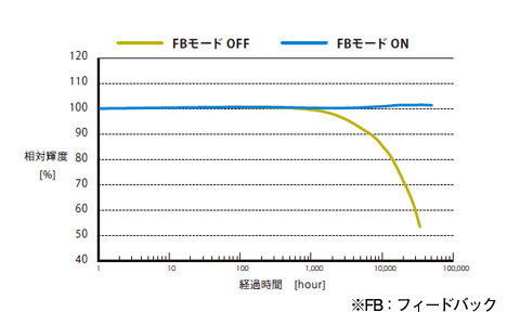 “OPRシリーズ”はバー照明“OPB-Sシリーズ“に続くセンシング照明第二弾となり、LED照明に輝度センサを内蔵してLED照明コントローラ “OPPFシリーズ”と接続することで電力線通信による輝度のモニタリングとフィードバック制御が可能です(特許出願中)。この新機能「FALUX sensing」の搭載により、モニタ値の変動に対して電圧を可変して、初期の輝度を維持します。よって約4万時間でも当初の輝度を維持することができ、長期の安定性を得ることができます。