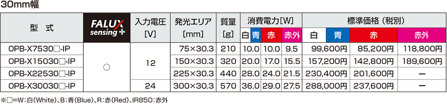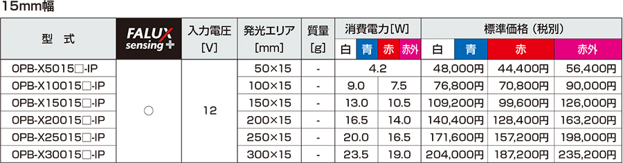 またOPB-X-IPシリーズは、当社独自の明るさ“見える化”技術『FALUX sensing +(ファルクスセンシングプラス)』に対応し、多機能LED照明コントローラ「OPPXシリーズ」と接続することで、輝度・温度などのモニタリング・フィードバック制御が可能。さらに累積点灯時間などの個体情報をコントローラで参照することができます。さらに、現行機種のセンシングバー照明「OPB-Sシリーズ」との比較で明るさ4.8倍(白色)を実現し、防塵・防水仕様でありながら高輝度なバー照明として様々な検査用途に対応します。