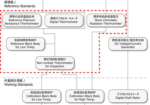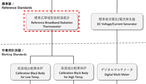 ●従来使用していた「標準白金測温抵抗体」、「標準デジタルサーモメータ」、「低温域標準黒体炉」、「検定用放射温度計」、「標準単色放射温度計」の使用を廃し、新しく「標準広帯域型放射温度計」を導入します。